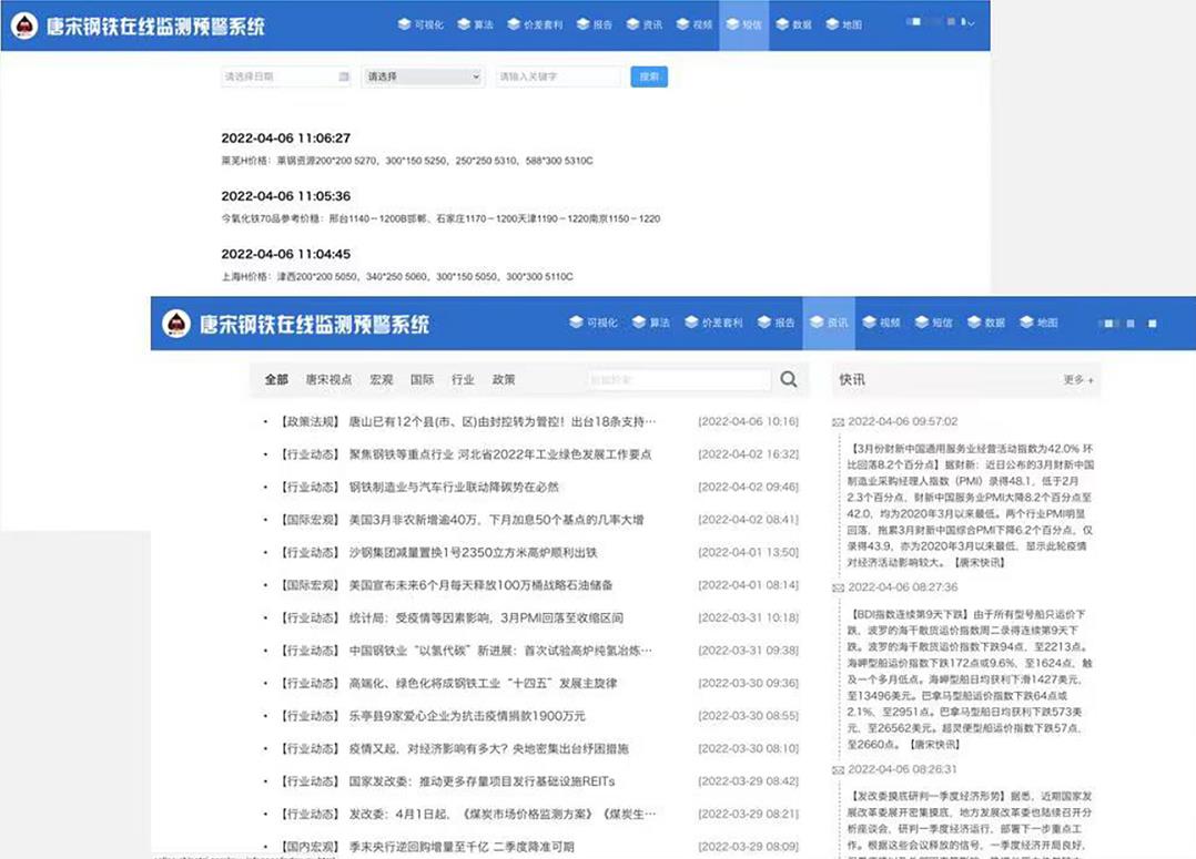 唐宋钢铁在线监测预警平台是唐宋集团依托自有研发团队打造的国内一流行业智能决策平台,在唐宋数据库、信息平台和唐宋钢铁经济研究院一系列研究成果的基础上,建立行业专家定期审定制度,利用一系列经济指标、技术指标建立起来的市场和行业的“晴雨表”和“报警器”。